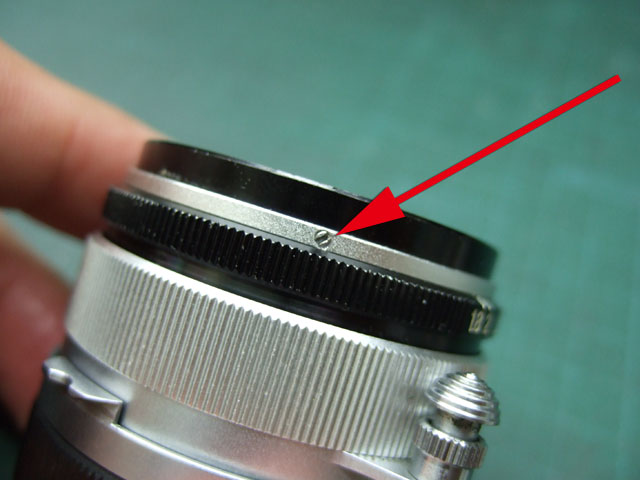 レンズ前群を外すには、まずは矢印のマイナスネジを緩めます。