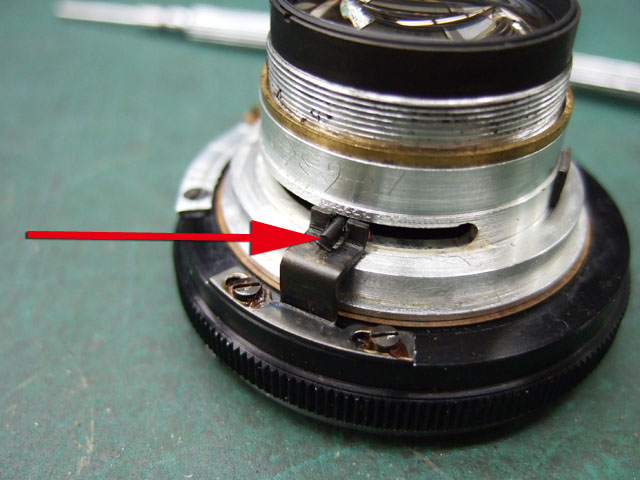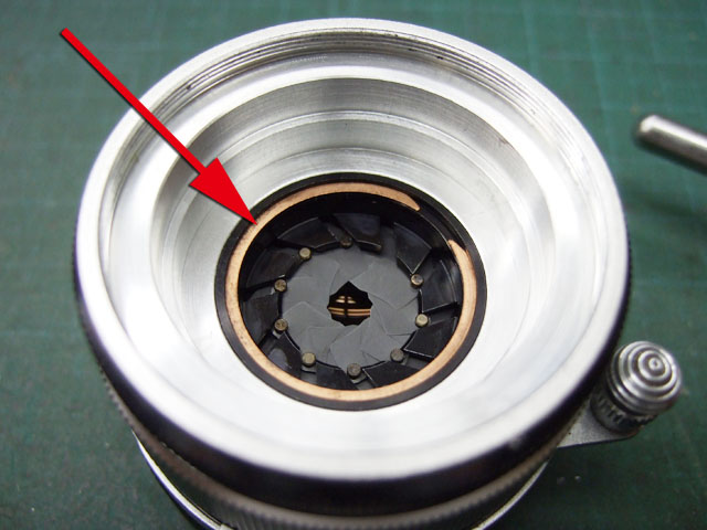 矢印のCリングを外せば絞り羽根の押さえが取れるんですが、まだ取れません。