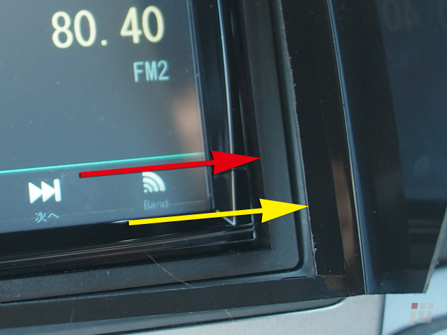 赤矢印の位置、つまり化粧枠の内側に合わせるつもりだったのに、作ったものは黄矢印の位置までズレてます。
