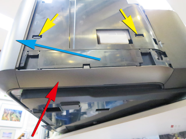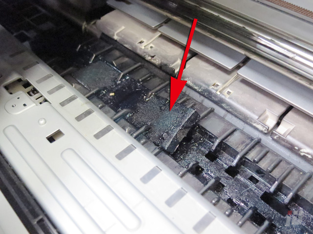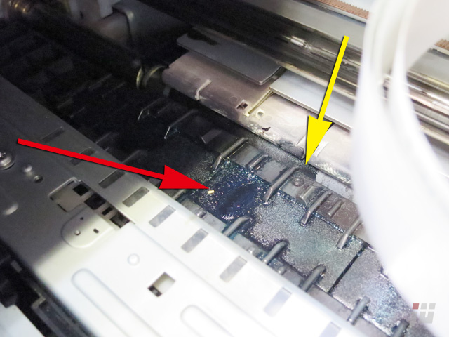 余ったインクを吸い取るような部分(赤矢印)があふれて、紙送りのローラー(黄矢印)にインクが付いてしまってますね。
