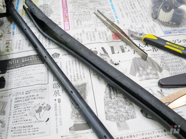 ゴムが朽ちて傷だらけのローラーを、なんとかできないかやってみましょう。