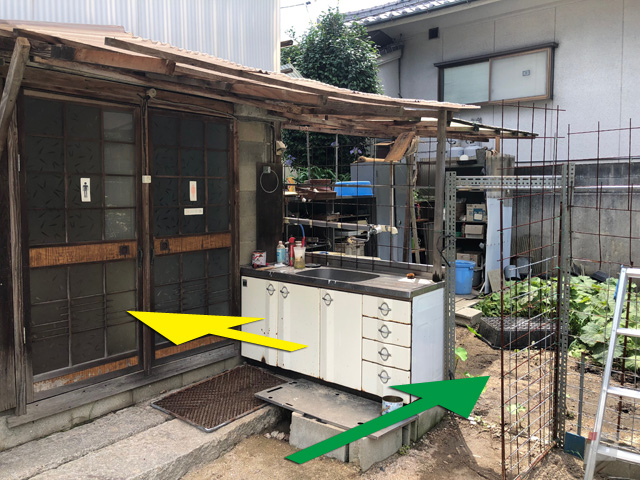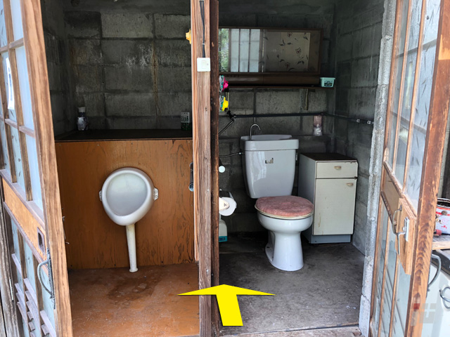その横(黄矢印)にトイレがありますので、ここもご自由にお使いください。