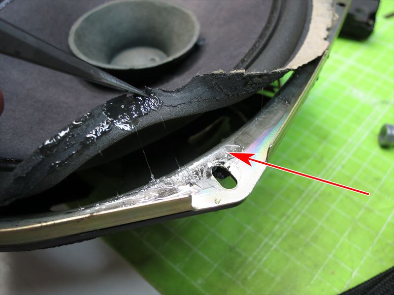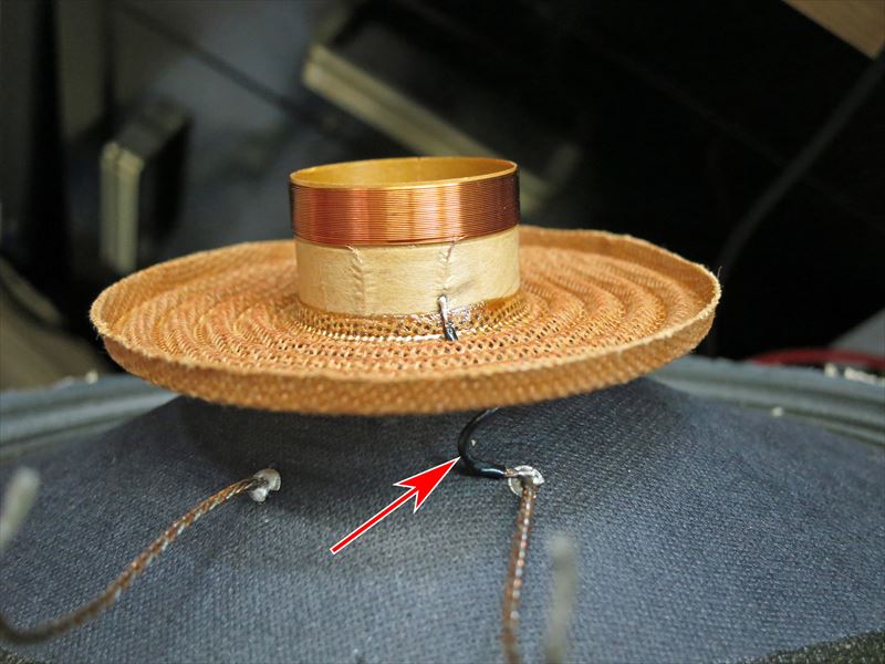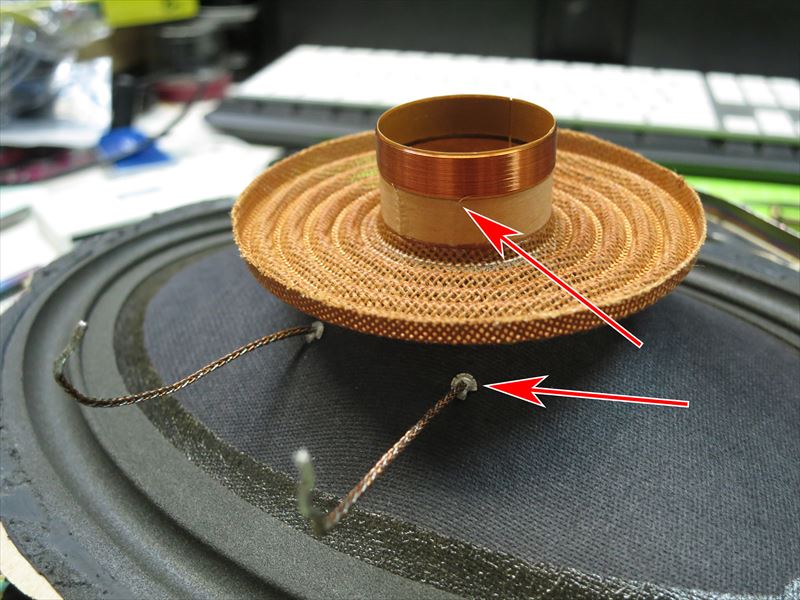 どうやらコイルの端からコーンにつながるところまでの間、矢印から矢印の間のどこかで断線している。