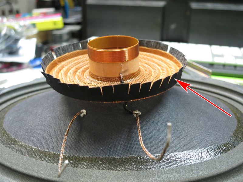 ではコーンとコイルを外したいのですが、これらはコイルを位置決めしている「ダンパー」と呼ばれる部分と、コーンの位置決めをしている「エッジ」という部分でフレームに留まっています。