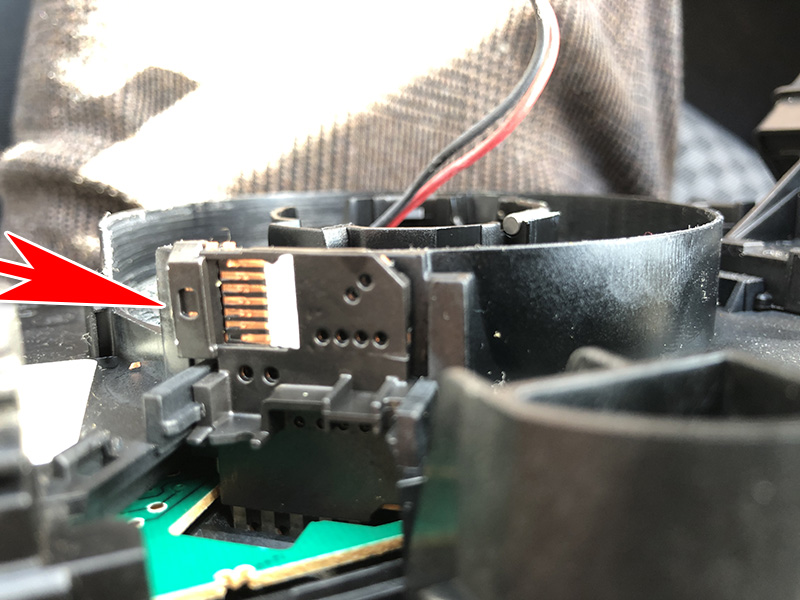 その隙間にフレキシブルケーブルの端を差し込むんですが、そのままでは入らないので、矢印の端の部分を少し切って幅を狭くすると差し込めます。