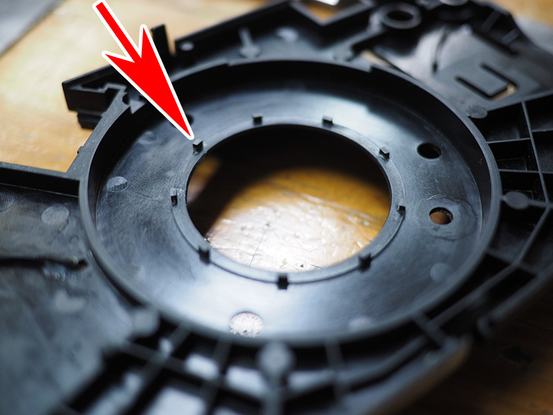 先ほどの内側のギアの部品は、この写真で言うと下からはめる形で、固定爪で引っかかる感じなんですが、その固定爪と、この写真の部品との間に結構な隙間があって、当然ガタガタなんですね。