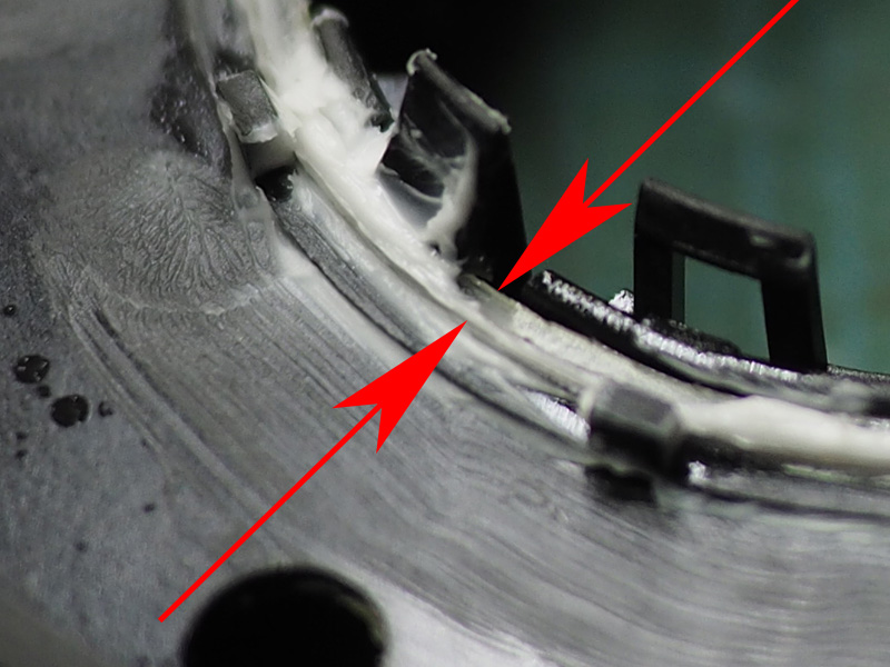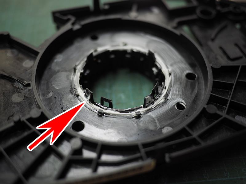 矢印の部分にシムを入れて、内側のギアの固定爪とベース部との隙間を無くしてやりましょう。