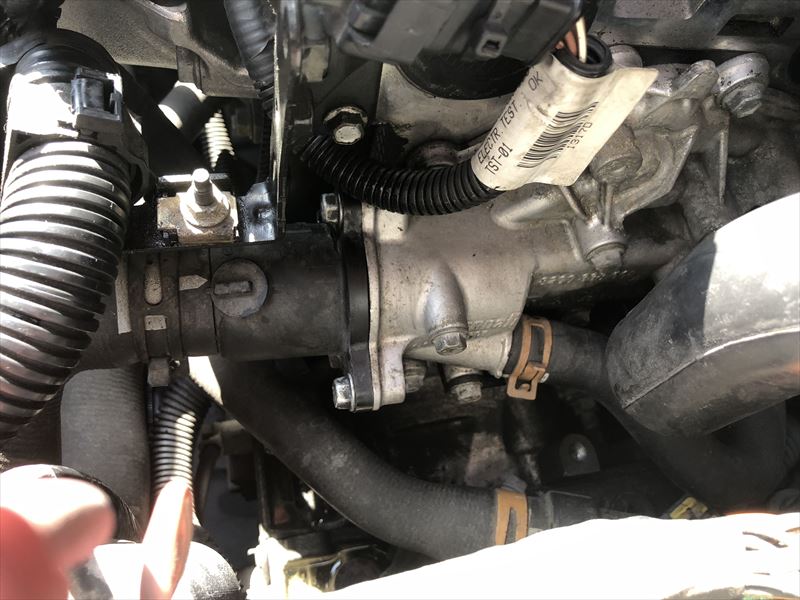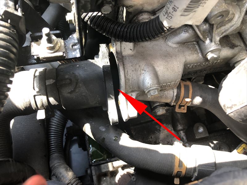 このクルマの場合、矢印の部分で分割できない、ハウジング一体型のサーモスタットが付いた車もあるのですが、幸いにもこのクルマは矢印の部分で分割できる仕様で、サーモスタット単体で取り出せるようになっています。