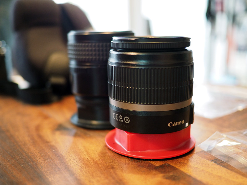 でもこれをバッグの底とかに固定しとけば、ボディーから外したレンズをそのままバッグの中に固定できそう。バッグからレンズを取り出すときにもキャップが外れてる。