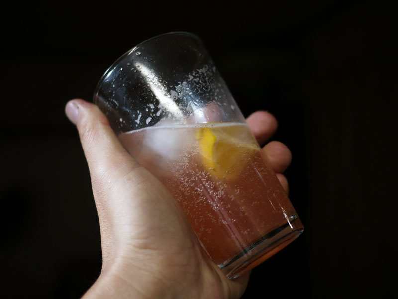 ではでは加熱している待ち時間に、ドライ用に煮詰めたあとに残った煮汁を、グラスに入れて炭酸で割って、氷とレモンを入れて、