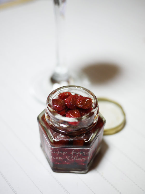 ドライチェリーを入れたビンにラム酒を入れて、一日置いときましょうか。